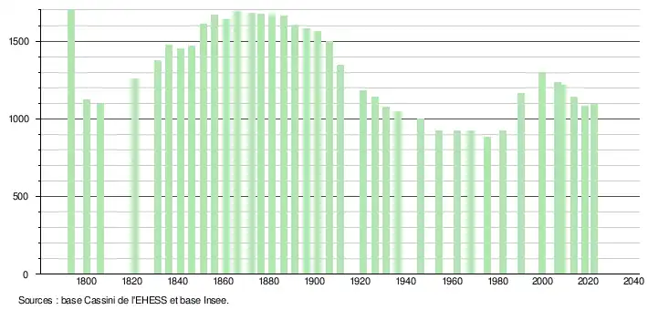 L'évolution du nombre d'habitants est connue à travers les recensements de la population effectués dans la commune depuis 1793. Pour les communes de moins de 10 000 habitants, une enquête de recensement portant sur toute la population est réalisée tous les cinq ans, les populations de référence des années intermédiaires étant quant à elles estimées par interpolation ou extrapolation[24]. Pour la commune, le premier recensement exhaustif entrant dans le cadre du nouveau dispositif a été réalisé en 2008[25].