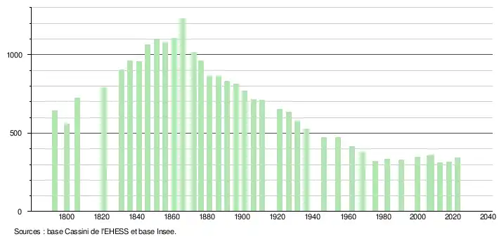 | L'évolution du nombre d'habitants est connue à travers les recensements de la population effectués dans la commune depuis 1793. Pour les communes de moins de 10 000 habitants, une enquête de recensement portant sur toute la population est réalisée tous les cinq ans, les populations de référence des années intermédiaires étant quant à elles estimées par interpolation ou extrapolation[18]. Pour la commune, le premier recensement exhaustif entrant dans le cadre du nouveau dispositif a été réalisé en 2007[19]. En 2022, la commune comptait 345 habitants[Note 1], en évolution de +9,18 % par rapport à 2016 (Landes : +5,78 %, France hors Mayotte : +2,11 %). |