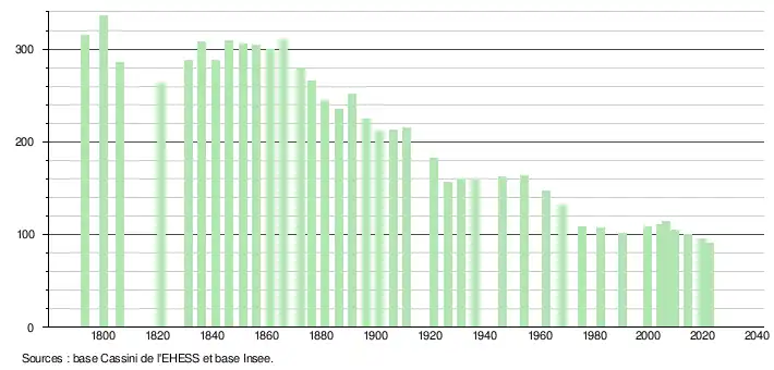 L'évolution du nombre d'habitants est connue à travers les recensements de la population effectués dans la commune depuis 1793. Pour les communes de moins de 10 000 habitants, une enquête de recensement portant sur toute la population est réalisée tous les cinq ans, les populations de référence des années intermédiaires étant quant à elles estimées par interpolation ou extrapolation[17]. Pour la commune, le premier recensement exhaustif entrant dans le cadre du nouveau dispositif a été réalisé en 2004[18].