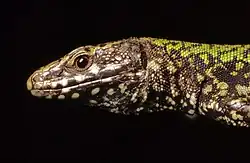 - L'écaille massétérique[Note 2] du Lézard des murailles est en général bien visible, assez grosse et ronde, entourée d'écailles temporales nombreuses et plus petites[23].