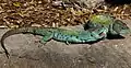 Il se défend en mordant, griffant et émettant des râles, sortes de sifflements sourds. Il possède également, comme beaucoup de lézards, la capacité d'autotomie, c'est-à-dire de perdre volontairement une partie de sa queue afin de fuir les prédateurs. Ainsi, de nombreux mâles ont des queues régénérées (sur 25 observations de mâles, ce fut le cas pour 22 d'entre eux)[58]. Cette capacité permet de distraire l'agresseur en lui laissant un maigre butin ou en lui échappant si celui-ci retenait le reptile par la queue.