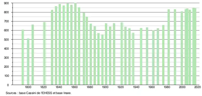 L'évolution du nombre d'habitants est connue à travers les recensements de la population effectués dans la commune depuis 1793. Pour les communes de moins de 10 000 habitants, une enquête de recensement portant sur toute la population est réalisée tous les cinq ans, les populations de référence des années intermédiaires étant quant à elles estimées par interpolation ou extrapolation[17]. Pour la commune, le premier recensement exhaustif entrant dans le cadre du nouveau dispositif a été réalisé en 2004[18].