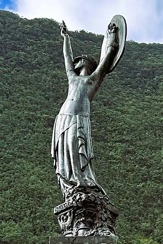 Cette posture singulière formant un V n'est pas gratuite. D'après Le Quotidien de La Réunion, « cette femme symbolise “la victoire de la France à ses morts reconnaissants” »[2], en l'occurrence elle est un hommage aux soldats qui sont tombés pendant la Première Guerre mondiale, une guerre à laquelle La Réunion et les Réunionnais ont participé pour la défense de la Patrie, notamment emmenés par l'aviateur Roland Garros. Ainsi, le personnage figure visuellement la gratitude du pays envers les Poilus grâce à ce que la base Mérimée des Monuments historiques appelle une « allégorie profane »[3], et la statue peut donc faire fonction de monument aux morts, comme c'est le cas sur l'île de l'océan Indien.