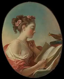 - ↑ Quelques exemples en profil : L'Enjeu perdu ou Le Baiser gagné c.1759-1760, Allégorie de la Vigilance (1772), Le Souvenir (c.1777), Jeune fille jouant avec un chien et un chat, Dites donc s'il vous plait (c.1780).