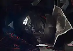 Sur le parquet à fines lattes de bois clair est étendu un tapis au champ beige uni et à la bordure en motifs géométriques persans[d], en partie retourné. Un carton à dessins est à demi ouvert, tandis que des estampes et des dessins, pliés, roulés ou froissés, parsèment la pièce. À ce mélange éclectique de luxe et de bric-à-brac vient s'ajouter l'objet le plus curieux du lot, la sphère réfléchissante.