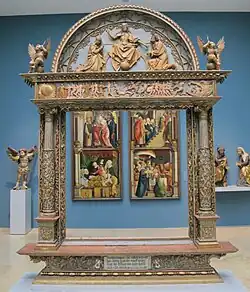 Cee premier exemple du travail de Dürer en tant qu'artiste décorateur comprend le retable, son cadre sculpté et les vitraux.