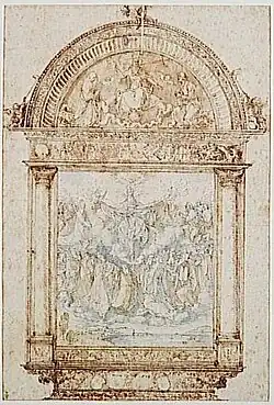 Un dessin de 1508 montre que le cadre en forme de portail figure dès la conception. La couleur du cadre sculpté était probablement exactement adapté au tableau ; il a été exécuté par Veit Stoss. Dürer conçoit le cadre dans le style Renaissance avec des colonnes entièrement sculptées qui soutiennent un pignon en plein cintre.