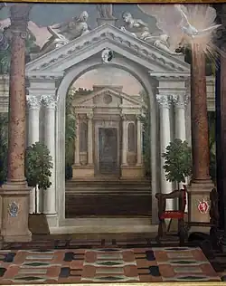 Conçue initialement pour la Scuola dei Mercanti (où la peinture restera jusqu'an 1811[3]) plus précisément sur un mur allant à la Sala dell' Albergo, la peinture est percée au centre pour permettre le passage vers celle-ci[1]. Le dispositif perspectif s'éloigne donc pragmatiquement des impératifs picturaux albertiens du Quattrocento où les détails architecturaux expriment des sens sacrés (Columna est Christus, infini non montrable sur le point de fuite...). Ce dispositif est devenu invisible depuis son déplacement de son emplacement in situ, avec son implication dans l'architecture réelle. Loin d'être « théologisée », la perspective est ouvertement « théâtralisée »[1].