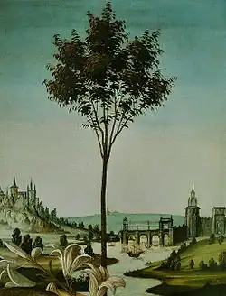Le paysage que l’on aperçoit par la fenêtre, s’étendant très loin et mettant en place un paysage idéalisé, représente le Paradis perdu, que le Christ va racheter. On voit un tout jeune chêne, arbre sacré chez les Grecs et chez les Romains. Il symbolise l’infini temporel, tandis que la taille du paysage représente l’infini spatial.