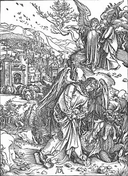 En haut à droite, Jean se tient sur une colline avec un ange, l'ange pointe vers la « nouvelle Jérusalem », dont la porte de la ville est gardée par un autre ange. Comme dans tous les paysages urbains, Dürer dépeint une ville allemande contemporaine.