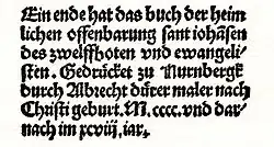 Les titres des deux éditions de 1498 avec leur calligraphie élaborée sont gravés dans le bois et non sertis de caractères mobiles. Pour la nouvelle édition de 1511, Dürer agrandit la gravure sur bois du titre pour inclure une représentation picturale de l'évangéliste Jean et de la Vierge à l'Enfant. Jean est identifié par son symbole évangéliste, l'aigle. La Vierge porte une couronne d'étoiles, est entourée d'un nimbe et repose sur un croissant de lune. Ce symbolisme vient de l'Apocalypse(Ap 12,1) : « Un grand signe apparut dans le ciel : une Femme, ayant le soleil pour manteau, la lune sous les pieds, et sur la tête une couronne de douze étoiles[26] ».