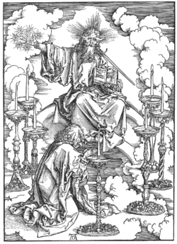 Comme dans toutes les figures, Dürer suit très fidèlement le texte de l'Apocalypse. Le Fils de l'homme trône sur un double arc-en-ciel ; devant lui Jean s'agenouille sur un banc de nuages. Les sept magnifiques lustres sont disposés presque symétriquement. Dürer a appris le métier d'orfèvre dans sa jeunesse et il s'intéresse particulièrement aux riches décorations qui différent sur tous les bougeoirs.