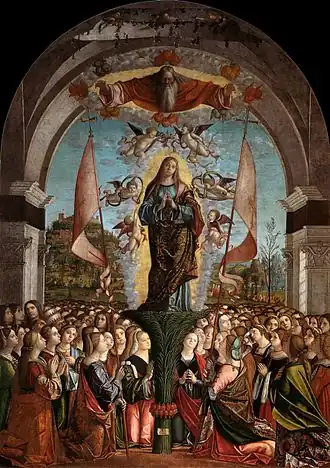 La scène montre Ursule en apothéose sur un palmier (symbole du martyre), dans un nimbe de lumière parmi des anges aux rubans qui lui offrent une couronne tandis qu'au-dessus Dieu lui tend les bras pour l'accueillir au ciel. Ci-dessous se trouvent la multitude de martyrs de Cologne agenouillés, en particulier les 11 000 vierges mais aussi des figures masculines comme le prince et le pape. À l'extrême gauche se trouvent trois jeunes hommes debout : ils sont identifiés avec les fils de Antonio Loredan, défenseur de Scutari contre les Turcs. L'exploit d'Antonio est également rappelé par la forteresse en arrière-plan.