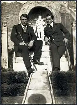 À gauche Pablo Picasso qui réalisa le décor du ballet en 1922, et à droite Léonide Massine qui reprit le rôle du faune après l'internement de Nijinski, et remonta le ballet en 1976.