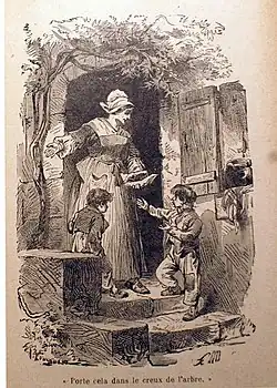 À leur arrivée, Moutier tente d'abord de faire une pause à l'Auberge Bournier, mais celle-ci refuse à cause de son chien. Ils se dirigent ensuite vers l'auberge de l'Ange Gardien, dirigée par l'excellente Mme Blidot et sa sœur Elfy, qui sont immédiatement charmées par les deux enfants. Après avoir pris conseil auprès des habitants du village, Moutier décide de confier les deux enfants à l'auberge de l'Ange Gardien. En outre, Jacques fait la rencontre de Torchonnet, un enfant chargé de toutes les tâches ingrates à l'Auberge Bournier, et Mme Blidot accepte qu'il dépose de la nourriture chaque soir près du puits.