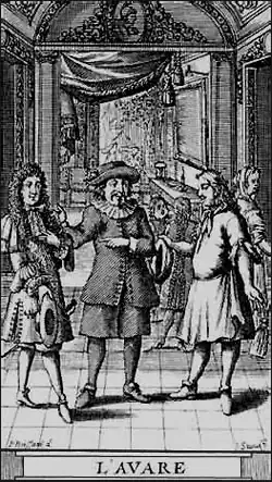 L'Avare est une comédie de Molière en cinq actes et en prose, inspirée par La Marmite (Aulularia) de Plaute[1] et représentée pour la première fois sur la scène du Palais-Royal le [2]. Il s'agit d'une comédie de caractère dont le personnage principal, Harpagon, est caractérisé par son avarice caricaturale. Harpagon tente de marier sa fille de force, tout en protégeant obstinément une cassette pleine d'or. Les cinq actes comportent respectivement cinq, cinq, neuf, sept et six scènes.