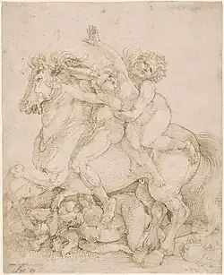 Le Morgan Library and Museum conserve un dessin préparatoire présentant, outre l'absence de paysage, deux différences notables : la licorne n'y est qu'un simple cheval tandis que des cadavres d'hommes et de femmes, entiers ou mutilés, sont visibles au sol.