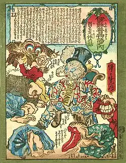 Ambrose Bierce a appliqué la fable aux conflits du travail dans ses Fantastic Fables (1899). Lorsque les ouvriers d'une usine de chaussures se mettent en grève pour de meilleures conditions, dans sa réécriture satirique, le propriétaire y met le feu afin de percevoir l'assurance et les laisse ainsi sans travail[11]. Une estampe japonaise légèrement antérieure de Kawanabe Kyōsai dans sa série Isoho Monogotari (1870-1880) avait également donné à la fable une application commerciale. Intitulé Le Paresseux au milieu, il montre le ventre assis fumant une pipe tandis que les membres du corps disjoints rampent sur le sol autour de lui. Sa large cravate est étiquetée « Financier » en lettres occidentales afin de ne laisser aucun doute à son interprétation. Dans ces deux cas, l'argument du centre comme soutien est renversé. Loin de maintenir les membres en vie, les soucis égoïstes et les exigences avides du ventre sapent leur énergie.