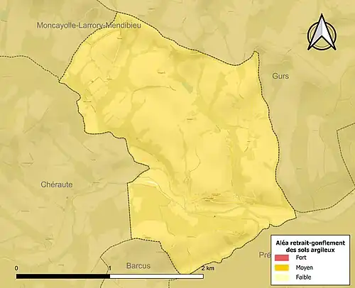 Le retrait-gonflement des sols argileux est susceptible d'engendrer des dommages importants aux bâtiments en cas d’alternance de périodes de sécheresse et de pluie[37]. La totalité de la commune est en aléa moyen ou fort (59 % au niveau départemental et 48,5 % au niveau national)[Carte 5]. Depuis le , en application de la loi ELAN, différentes contraintes s'imposent aux vendeurs, maîtres d'ouvrages ou constructeurs de biens situés dans une zone classée en aléa moyen ou fort[Note 7],[38].