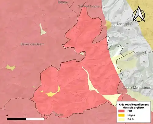 Le retrait-gonflement des sols argileux est susceptible d'engendrer des dommages importants aux bâtiments en cas d’alternance de périodes de sécheresse et de pluie[29]. 92,3 % de la superficie communale est en aléa moyen ou fort (59 % au niveau départemental et 48,5 % au niveau national)[Carte 4]. Depuis le , en application de la loi ELAN, différentes contraintes s'imposent aux vendeurs, maîtres d'ouvrages ou constructeurs de biens situés dans une zone classée en aléa moyen ou fort[Note 6],[30].