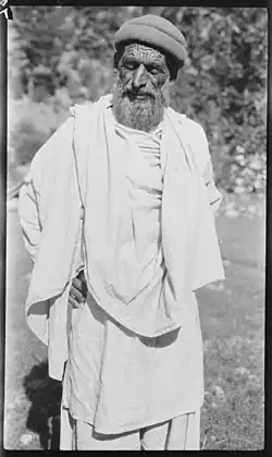Vallée de Rumbur (en), Chitral, Pakistan. Abdal Kadir, dernier malik (chef) pré-islamique des Kafirs rouges (Katirs). En 1896, un certain nombre d'entre eux fuirent la vallée de Bashgal, en Afghanistan, pour éviter l'islamisation forcée. - The file of the United Services' Institute, fait sans doute référence à une conférence de 1879 sur Le Kafristan [sic] et les kafirs de Henry Walter Bellew, auteur de nombreux écrits sur l'Afghanistan. Ce récit, comme celui de Wood, reposait en grande partie sur des récits de voyageurs indigènes de seconde main et sur « de brefs avis de ce peuple et de ce pays éparpillés dans les travaux de différents historiens autochtones ». La cause en est que, comme il l'a noté, « jusqu'à présent nous n'avons aucun récit de ce pays et de ses habitants par aucun voyageur européen qui les a lui-même visités ». Le récit de 29 pages sur l'histoire, les mœurs et les coutumes était aussi « sommaire et inexact » que le narrateur suggère, Bellew admettant que « de la religion des Kafirs, nous en savons très peu »[6].