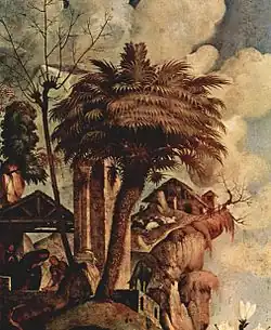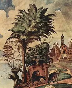 Les bâtiments de l'extrême haut du paysage à droite seraient ceux du sanctuaire de Montesenario, le couvent-mère des Servites de Marie, commanditaires de l'œuvre.