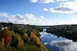 Pont Saint-Sylvain vu de l'aval et la statue de saint Sylvain. Le viaduc de L'Isle-Jourdain. Barrage de La Roche.