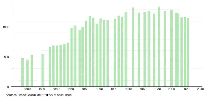 - ↑ Fiches Insee - Populations de référence de la commune pour les années 2006, 2007, 2008, 2009, 2010, 2011, 2012, 2013, 2014, 2015, 2016, 2017, 2018, 2019, 2020, 2021 et 2022.