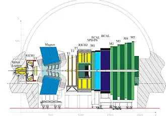- le système d'identification des particules dont le rôle est d'identifier les particules produites au cours des collisions de protons. Ses principaux éléments sont deux détecteurs RICH qui peuvent discerner les kaons, les muons, les protons et les pions, un calorimètre électronique (principalement pour les électrons et les photons), un calorimètre hadronique (pour les hadrons chargés ou neutres) et enfin un détecteur de muons.