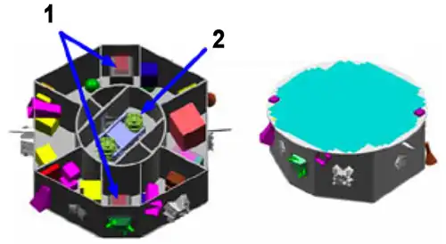 - ↑ douze clamps de fixation maintenaient chaque masse pour éviter l'influence des vibrations lors de la mise en orbite.