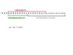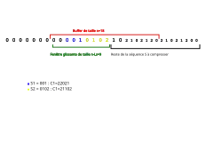 Dans cet exemple, n'importe quel indice de la fenêtre glissante pourrait être pris comme p1 (la plus longue correspondance est 00 quel que soit le pointeur initial), on choisit p1 =9 (cf. Image2_lz77)