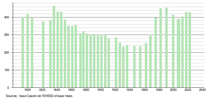 L'évolution du nombre d'habitants est connue à travers les recensements de la population effectués dans la commune depuis 1793. Pour les communes de moins de 10 000 habitants, une enquête de recensement portant sur toute la population est réalisée tous les cinq ans, les populations de référence des années intermédiaires étant quant à elles estimées par interpolation ou extrapolation[36]. Pour la commune, le premier recensement exhaustif entrant dans le cadre du nouveau dispositif a été réalisé en 2007[37].