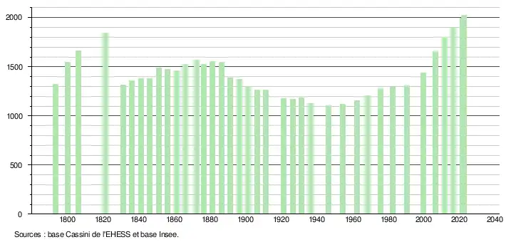 L'évolution du nombre d'habitants est connue à travers les recensements de la population effectués dans la commune depuis 1793. Pour les communes de moins de 10 000 habitants, une enquête de recensement portant sur toute la population est réalisée tous les cinq ans, les populations de référence des années intermédiaires étant quant à elles estimées par interpolation ou extrapolation[17]. Pour la commune, le premier recensement exhaustif entrant dans le cadre du nouveau dispositif a été réalisé en 2006[18].