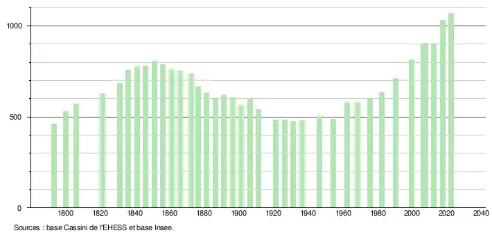 En 1793, la population de cette commune était de 392 âmes[15]. L'évolution du nombre d'habitants est connue à travers les recensements de la population effectués dans la commune depuis 1793. Pour les communes de moins de 10 000 habitants, une enquête de recensement portant sur toute la population est réalisée tous les cinq ans, les populations de référence des années intermédiaires étant quant à elles estimées par interpolation ou extrapolation[17]. Pour la commune, le premier recensement exhaustif entrant dans le cadre du nouveau dispositif a été réalisé en 2007[18].