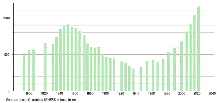 L'évolution du nombre d'habitants est connue à travers les recensements de la population effectués dans la commune depuis 1793. Pour les communes de moins de 10 000 habitants, une enquête de recensement portant sur toute la population est réalisée tous les cinq ans, les populations de référence des années intermédiaires étant quant à elles estimées par interpolation ou extrapolation[19]. Pour la commune, le premier recensement exhaustif entrant dans le cadre du nouveau dispositif a été réalisé en 2006[20].