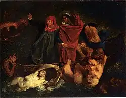 La toile d'Eugène Delacroix, La Barque de Dante ou Virgile et Dante aux enfers, peinte en 1822 est exposée au musée du Louvre, à Paris[4]. La seconde copie, qui se rapproche davantage de l’impressionnisme, se trouve au Metropolitan Museum of Art, à New York.