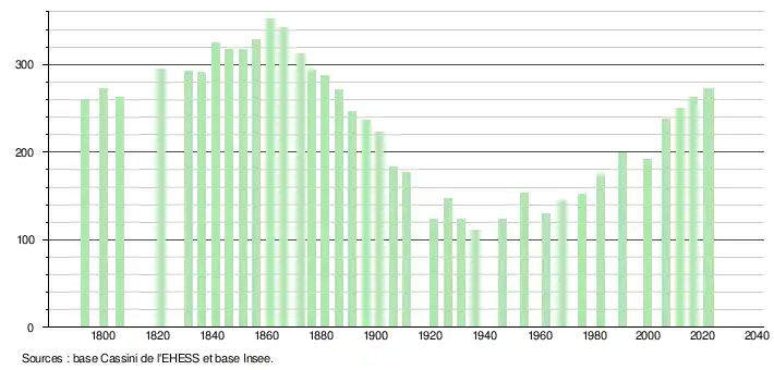 L'évolution du nombre d'habitants est connue à travers les recensements de la population effectués dans la commune depuis 1793. Pour les communes de moins de 10 000 habitants, une enquête de recensement portant sur toute la population est réalisée tous les cinq ans, les populations de référence des années intermédiaires étant quant à elles estimées par interpolation ou extrapolation[24]. Pour la commune, le premier recensement exhaustif entrant dans le cadre du nouveau dispositif a été réalisé en 2006[25].