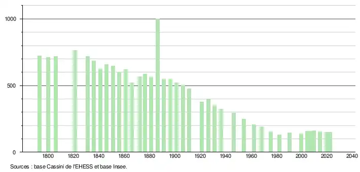 L'évolution du nombre d'habitants est connue à travers les recensements de la population effectués dans la commune depuis 1793. Pour les communes de moins de 10 000 habitants, une enquête de recensement portant sur toute la population est réalisée tous les cinq ans, les populations de référence des années intermédiaires étant quant à elles estimées par interpolation ou extrapolation[36]. Pour la commune, le premier recensement exhaustif entrant dans le cadre du nouveau dispositif a été réalisé en 2004[37].