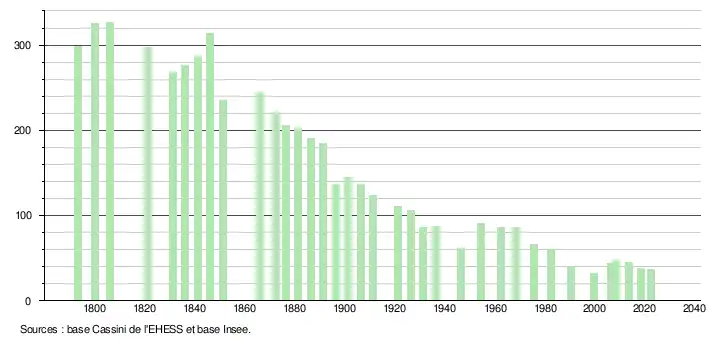 L'évolution du nombre d'habitants est connue à travers les recensements de la population effectués dans la commune depuis 1793. Pour les communes de moins de 10 000 habitants, une enquête de recensement portant sur toute la population est réalisée tous les cinq ans, les populations de référence des années intermédiaires étant quant à elles estimées par interpolation ou extrapolation[22]. Pour la commune, le premier recensement exhaustif entrant dans le cadre du nouveau dispositif a été réalisé en 2008[23].