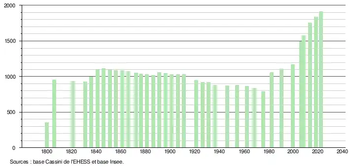 L'évolution du nombre d'habitants est connue à travers les recensements de la population effectués dans la commune depuis 1800. Pour les communes de moins de 10 000 habitants, une enquête de recensement portant sur toute la population est réalisée tous les cinq ans, les populations de référence des années intermédiaires étant quant à elles estimées par interpolation ou extrapolation[21]. Pour la commune, le premier recensement exhaustif entrant dans le cadre du nouveau dispositif a été réalisé en 2008[22].