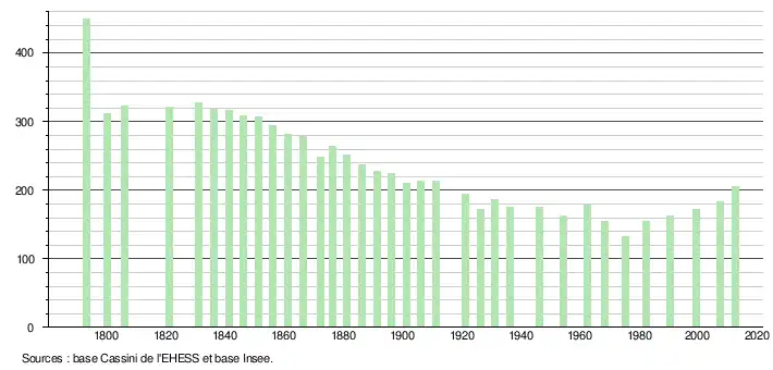 - ↑ Par convention dans Wikipédia, le principe a été retenu de n’afficher dans le tableau des recensements et le graphique, pour les populations légales postérieures à 1999, que les populations correspondant à une enquête exhaustive de recensement pour les communes de moins de 10 000 habitants, et que les populations des années 2006, 2011, 2016, etc. pour les communes de plus de 10 000 habitants, ainsi que la dernière population légale publiée par l’Insee pour l'ensemble des communes.