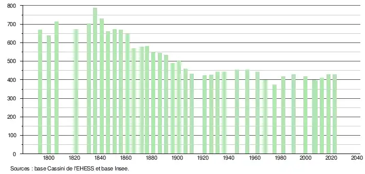 L'évolution du nombre d'habitants est connue à travers les recensements de la population effectués dans la commune depuis 1793. Pour les communes de moins de 10 000 habitants, une enquête de recensement portant sur toute la population est réalisée tous les cinq ans, les populations de référence des années intermédiaires étant quant à elles estimées par interpolation ou extrapolation[40]. Pour la commune, le premier recensement exhaustif entrant dans le cadre du nouveau dispositif a été réalisé en 2007[41].