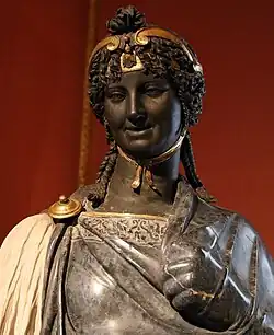 La statue est un assemblage moderne d'un torse ancien en marbre gris et d'ajouts en marbre blanc et bronze du Cordier[7]. Une restauration, qui a débarrassée l'œuvre d'une épaisse patine noire ajoutée au XIXe siècle pour convenir au goût de l'époque, a également révélé une frange dorée présente sur le vêtement de la femme[8]. L'assemblage d'éléments anciens et modernes donne à la sculpture une saveur exotique, presque orientale[1]. Cette technique multi-matériaux, qui rend l'œuvre polychrome, avait déjà été utilisée par Il Franciosino pour une statue de la basilique Sainte-Agnès-hors-les-Murs à Rome, qui représente Agnès de Rome[8]. Cette comparaison a amené Aldo De Rinaldis à proposer l'identification de la sculpture comme une œuvre de l'artiste lorrain[7],[9], alors qu'auparavant elle avait été attribuée par Adolfo Venturi au sculpteur italien Tiburzio Vergelli, par comparaison avec la Charité qu'il a créée pour les fonts baptismaux de la basilique de Lorette[10].