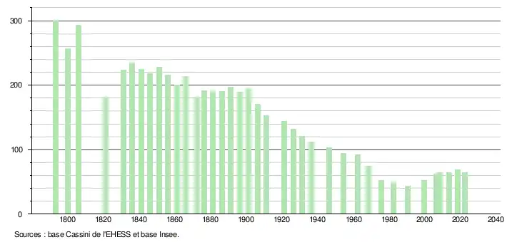 L'évolution du nombre d'habitants est connue à travers les recensements de la population effectués dans la commune depuis 1793. Pour les communes de moins de 10 000 habitants, une enquête de recensement portant sur toute la population est réalisée tous les cinq ans, les populations de référence des années intermédiaires étant quant à elles estimées par interpolation ou extrapolation[14]. Pour la commune, le premier recensement exhaustif entrant dans le cadre du nouveau dispositif a été réalisé en 2008[15].
