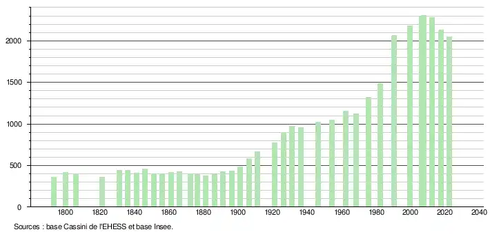 L'évolution du nombre d'habitants est connue à travers les recensements de la population effectués dans la commune depuis 1793. Pour les communes de moins de 10 000 habitants, une enquête de recensement portant sur toute la population est réalisée tous les cinq ans, les populations de référence des années intermédiaires étant quant à elles estimées par interpolation ou extrapolation[24]. Pour la commune, le premier recensement exhaustif entrant dans le cadre du nouveau dispositif a été réalisé en 2007[25].