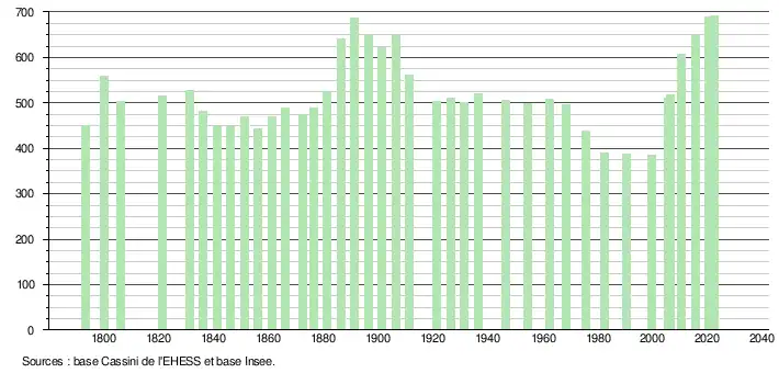 L'évolution du nombre d'habitants est connue à travers les recensements de la population effectués dans la commune depuis 1793. Pour les communes de moins de 10 000 habitants, une enquête de recensement portant sur toute la population est réalisée tous les cinq ans, les populations de référence des années intermédiaires étant quant à elles estimées par interpolation ou extrapolation[29]. Pour la commune, le premier recensement exhaustif entrant dans le cadre du nouveau dispositif a été réalisé en 2005[30].