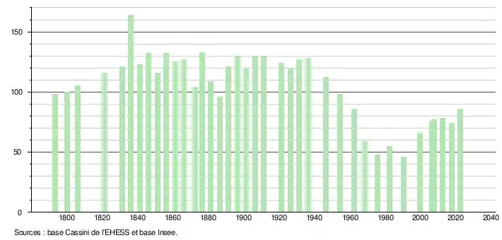L'évolution du nombre d'habitants est connue à travers les recensements de la population effectués dans la commune depuis 1793. Pour les communes de moins de 10 000 habitants, une enquête de recensement portant sur toute la population est réalisée tous les cinq ans, les populations de référence des années intermédiaires étant quant à elles estimées par interpolation ou extrapolation[16]. Pour la commune, le premier recensement exhaustif entrant dans le cadre du nouveau dispositif a été réalisé en 2007[17].