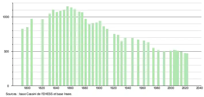 L'évolution du nombre d'habitants est connue à travers les recensements de la population effectués dans la commune depuis 1793. Pour les communes de moins de 10 000 habitants, une enquête de recensement portant sur toute la population est réalisée tous les cinq ans, les populations de référence des années intermédiaires étant quant à elles estimées par interpolation ou extrapolation[27]. Pour la commune, le premier recensement exhaustif entrant dans le cadre du nouveau dispositif a été réalisé en 2004[28].