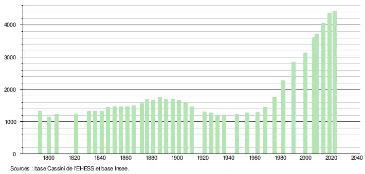 L'évolution du nombre d'habitants est connue à travers les recensements de la population effectués dans la commune depuis 1793. Pour les communes de moins de 10 000 habitants, une enquête de recensement portant sur toute la population est réalisée tous les cinq ans, les populations de référence des années intermédiaires étant quant à elles estimées par interpolation ou extrapolation[51]. Pour la commune, le premier recensement exhaustif entrant dans le cadre du nouveau dispositif a été réalisé en 2008[52].