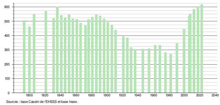L'évolution du nombre d'habitants est connue à travers les recensements de la population effectués dans la commune depuis 1793. Pour les communes de moins de 10 000 habitants, une enquête de recensement portant sur toute la population est réalisée tous les cinq ans, les populations de référence des années intermédiaires étant quant à elles estimées par interpolation ou extrapolation[27]. Pour la commune, le premier recensement exhaustif entrant dans le cadre du nouveau dispositif a été réalisé en 2007[28].